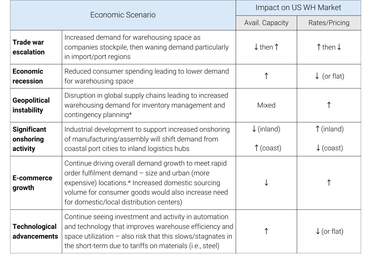 The reciprocal nature of tariffs means tariff retaliation, manufacturing footprint shifts, trade rerouting and other activities could have multiple potential knock-on effects across the U.S. warehouse market.